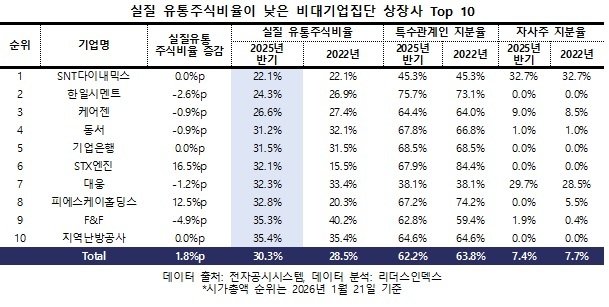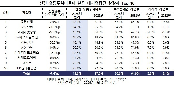 시총을 떠받치는 대기업 계열사들이 오히려 증시 유동성을 제약하는 역설적인 구조가 고착화되고 있다는 분석이다. 개별 기업으로 보면 유통주식 비율이 가장 낮은 곳은 동원그룹 지주사 동원산업으로, 2025년 반기 기준 12.1%에 불과했다.