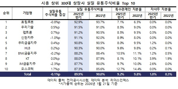 반면 유통주식 비율이 가장 높은 기업은 휴림로봇(92.9%)이었다. 우리기술, 펩트론, 신한지주, 우리금융지주, HLB, BNK금융지주, KT 등이 뒤를 이었다. 상위권에 금융지주사가 다수 포함된 점은 지배주주가 없는 업종 특성상 유통 비중이 상대적으로 높게 유지되는 구조를 보여준다.
