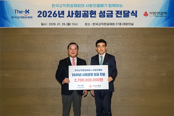 [서울타임즈뉴스 = 허성미 기자] 한국교직원공제회(이사장 정갑윤, 이하 ‘공제회’)가 1월 26일 사회복지공동모금회(회장 김병준, 이하 ‘사랑의열매’)와 2026년 성금 전달식을 개최하고, 사회공헌사업 협력을 본격적으로 이어가기로 했다. 2026년 한 해 동안 총 27억원 규모의 성금을 사랑의열매에 전달할 예정이며, 사랑의열매와의 협업을 통해 다양한 사회공헌사업을 지원할 계획이다.