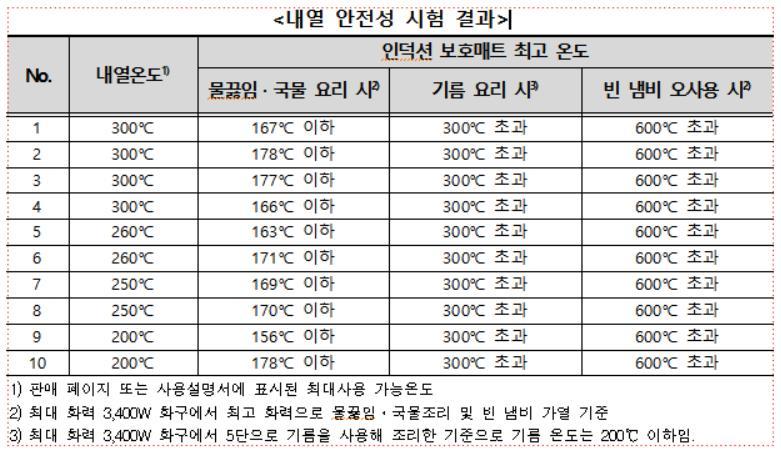 시험 결과 국물이 있는 상태에서 조리할 경우에는 모든 제품에서 이상이 발견되지 않았다. 하지만 최대 화력(3,400W)의 중간 단계로 가열했을 때 평균 8분 38초가 지나자 보호매트 온도가 각 제품의 내열 한계인 200~300℃를 모두 넘긴 것으로 나타났다. 특히 국물이 모두 증발해 빈 냄비 상태가 되면 평균 77초 만에 온도가 600℃ 이상으로 급상승해 화재 위험에 노출됐다.