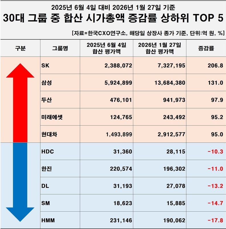 29일 기업분석전문 한국CXO연구소가 ‘국내 30대 그룹의 2025년 6월4일 대비 2026년 1월 27일 기준 시총 변동 분석’ 결과 이같은 결과가 도출됐다고 발표했다. 조사 결과 李정부가 출범한 작년 6월4일 기준 30대 그룹의 전체 시총 규모는 1680조 원 수준이었다.