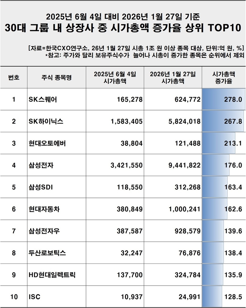 이번 조사 대상 30대 그룹에 속한 단일 주식종목 250개 중 73.2%에 해당하는 183개 종목은 시총이 증가했지만, 26.8%(67개 종목)는 하락해 희비가 교차했다. 이달 27일 기준 시총이 1조 원 넘고, 주가 상승에 따라 시총이 상승한 종목 중에서는 SK그룹에 속한 ‘SK스퀘어’와 ‘SK하이닉스’가 시총 증가율 1~2위를 차지해 눈길을 끌었다.
