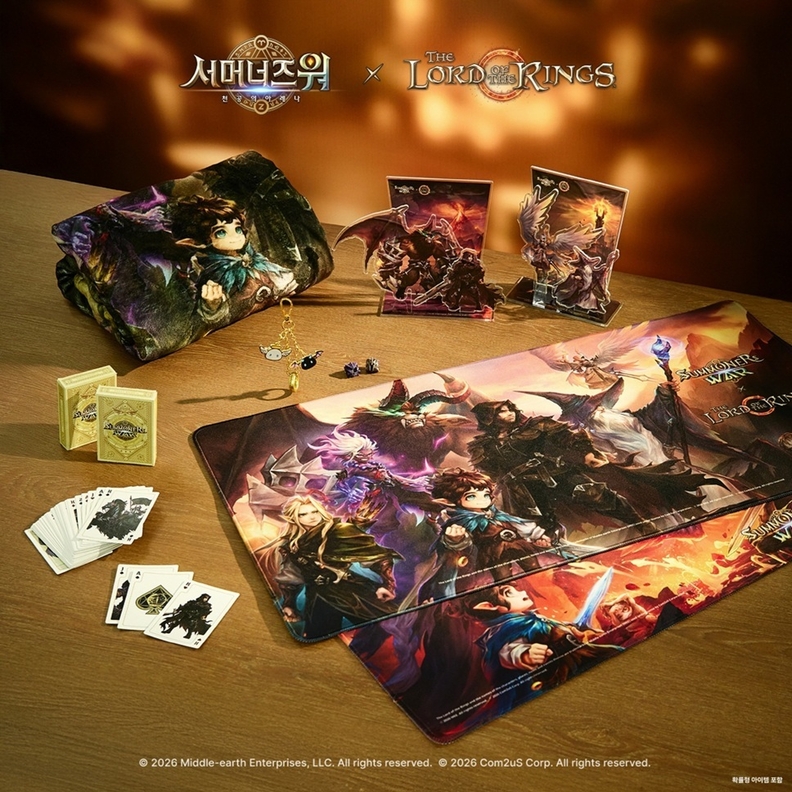 공개된 제품은 아티산 키캡 세트, 메탈 키링, 플레잉카드, 원정대 블랭킷, 데스크매트 2종, 아크릴 스탠드 2종 등 총 6종이다. ‘서머너즈 워’의 인기 몬스터를 ‘반지의 제왕’ 특유의 장엄한 세계관으로 재해석해 실용성과 팬심을 동시에 만족시키는 구성이 특징이다.