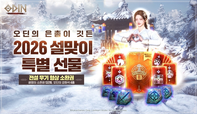 ‘2026년 설 기념 오딘의 유물 강화석 지급 특별 미션’을 통해 유물 관련 미션을 완료하면 ‘오딘의 유물 강화석’ 2개가 지급된다. 오는 2월 16일부터 18일까지는 설연휴 기간 접속 시 ‘광명의 소환권’을 최대 66장 제공하는 푸시 이벤트도 실시된다.