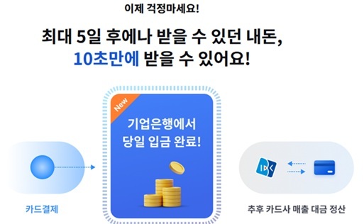 [서울타임즈뉴스 = 최남주 기자] IBK기업은행(은행장 장민영)은 소상공인의 자금 유동성 확대를 위해 ‘카드매출 바로입금 서비스’를 개선해 다음 달 3일부터 정식 운영한다고 11일 밝혔다. ‘카드매출 바로입금 서비스’는 카드 결제 후 입금까지 2~5일 소요되던 카드결제대금을 별도 비용 없이 카드 가맹점에 즉시 입금해 주는 서비스다.