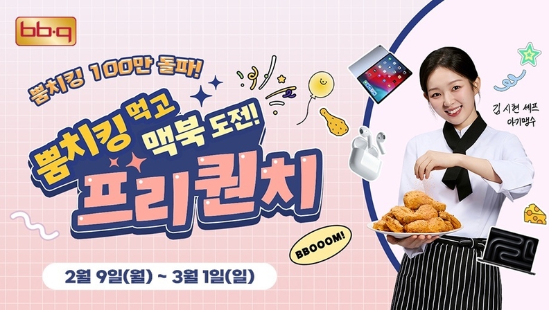 프리퀀치 이벤트는 BBQ 앱에서 ‘뿜치킹’ 1마리 이상 주문할 경우 프리퀀치 1개가 적립되며 적립된 프리퀀치 개수에 따라 경품 응모가 가능하다. 프리퀀치 5개 적립 시 맥북 응모(1명), 3개 적립 시 아이패드 응모(2명), 2개 적립 시 에어팟 응모(7명)가 가능하다. 이벤트는 오는 3월 1일까지 진행되며 중복 응모도 가능하다. 당첨자는 3월 중 발표될 예정이다.