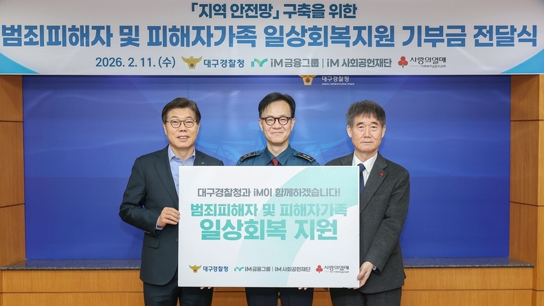 [서울타임즈뉴스 = 최남주 기자] iM금융그룹 iM사회공헌재단(이사장 황병우)은 지난 11일 대구광역시 수성구에 소재한 대구경찰청에서 강력범죄로 고통을 호소하고 있는 취약계층 피해자와 피해자 가족의 일상회복을 돕고 지역 안전망 구축을 위한 후원금 전달식을 진행했다고 밝혔다.