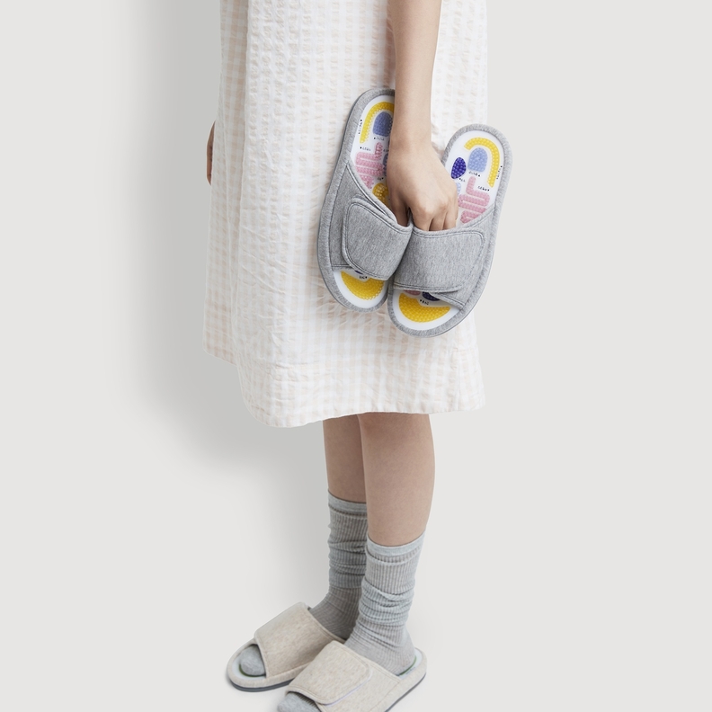 자주의 지압 거실화는 발바닥 주요 지압점과 연계된 신체 부위를 알 수 있게 보여주는 도형 표시가 특징이다. 이를 통해 소비자는 착용 후 영향을 미칠 수 있는 부분을 직관적으로 확인할 수 있으며, 집 안에서 자연스럽게 걸어 다니는 것만으로도 지속적인 발바닥 지압이 가능하다.