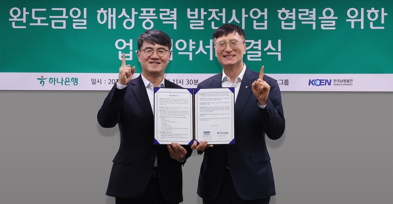 하나은행은 26일 한국남동발전과 ‘완도금일해상풍력 발전사업’의 성공적 추진을 위한 업무협약(MOU)을 체결했다고 27일 밝혔다. 이번 협약은 프로젝트파이낸싱(PF) 이전 단계부터 사업 구조와 리스크 요인을 공동 검토하고, 개발·건설·운영 전 과정에서 협력체계를 구축하기 위해 마련됐다.