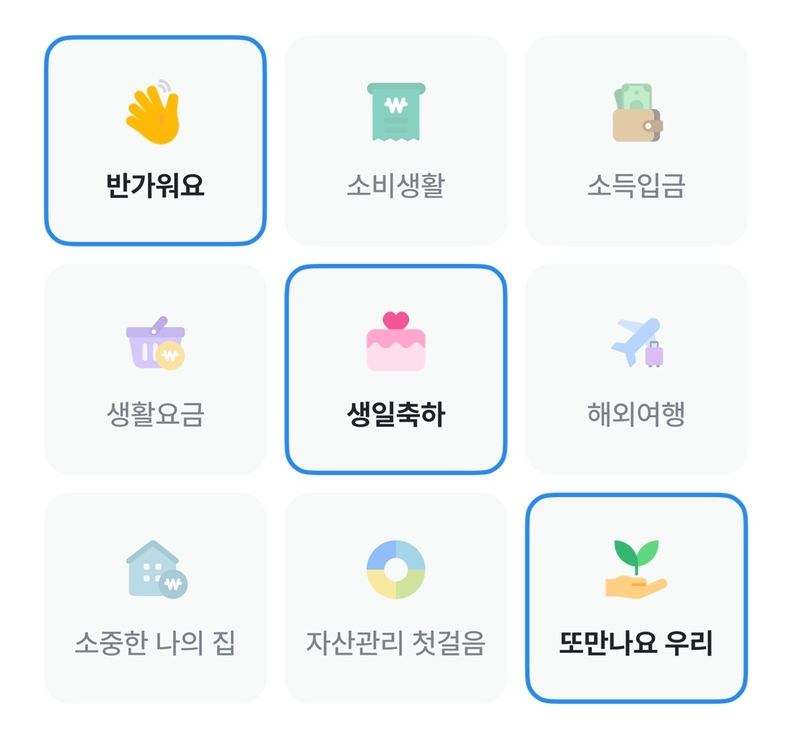 빙고판은 반가워요, 소비생활, 소득입금, 생활요금, 생일축하, 해외여행, 소중한 나의 집, 자산관리 첫걸음, 또만나요 우리 등 9개 칸으로 구성됐다. 생활비 입금, 환전, 자동이체 등 비교적 달성하기 쉬운 미션을 수행해 빙고 줄을 완성하면 최대 연 7.5%포인트의 우대금리가 더해져 최고 연 10% 금리를 받을 수 있다.