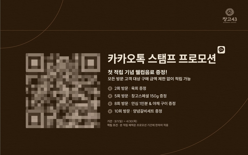 4월 30일까지 진행되는 이번 프로모션의 특징은 더 많은 고객이 혜택을 누릴 수 있도록 적립 기준을 완화했다는 점이다. 식사를 마친 후 창고43 카카오톡 채널을 추가해 제시하는 모든 방문 고객 개인별로 스탬프를 지급한다. 결제 금액 또한 제한이 없다. 구이류 뿐만 아니라 점심 식사 메뉴를 이용할 때도 동일하게 적립 받을 수 있다.