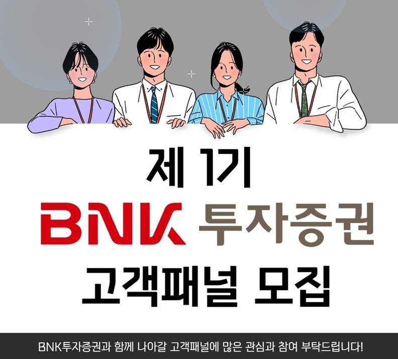 [서울타임즈뉴스 = 최남주 기자] BNK투자증권이 금융소비자의 의견을 반영한 투자 서비스 개선과 고객 중심 경영 강화를 위해 ‘제1기 BNK투자증권 고객패널’을 모집한다. BNK투자증권은 금융상품과 투자 서비스에 관심 있는 고객을 대상으로 고객패널을 선발한다고 5일 밝혔다.