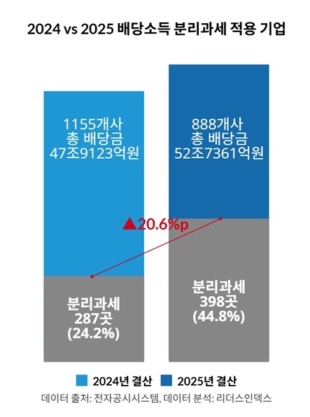 10일 기업분석연구소 리더스인덱스(대표 박주근)가 지난 6일까지 배당을 공시한 상장사 1068곳 중 당기순이익 파악이 가능한 888개사 배당 내용을 분석한 결과, 배당소득 분리과세 대상 기업은 398곳으로 44.8%를 차지했다. 2024년 결산 기준으로 배당을 실시한 상장사 1185곳을 동일 기준으로 분석했을 때 분리과세 대상 기업은 287곳(24.2%)에 불과했다.