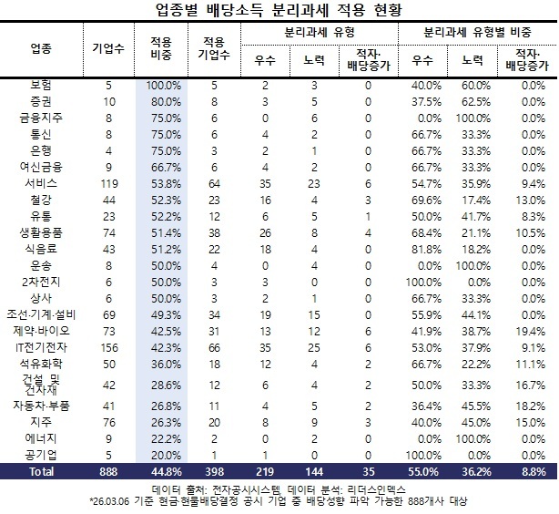 증권사 중에선 배당을 발표한 8개 기업 가운데 미래에셋증권(배당성향 11.0%)과 교보증권(배당성향 5.8%)을 제외한 나머지 증권사들이 대부분 분리과세 요건을 충족했다. 반면 건설(28.6%), 자동차부품(26.8%), 에너지(22.2%), 공기업(20.0%) 등 일부 업종은 분리과세 적용 비중이 30% 미만으로 상대적으로 낮았다. 이번 분리과세 적용 대상 기업중 당기순이익이 적자이지만 부채비율이 200% 미만인 기업도 33곳 포함됐다. LG화학, 롯데지주, LS머트리얼즈 등이 대표적인 기업들이다.