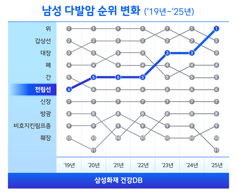 전립선암 증가세도 눈에 띈다. 국가암등록통계에서 전립선암은 처음으로 남성암 발생 1위를 기록했다. 2015년부터 2023년까지 연평균 10.2% 증가했다. 삼성화재 건강DB에서도 전립선암은 2019년 6위에서 2023년 3위로 상승했다. 2025년에는 1위로 나타나 향후 관리 중요성이 더욱 커질 것으로 전망된다.