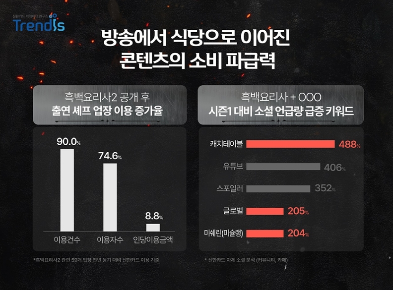 [서울타임즈뉴스 = 최남주 기자] 신한카드는 요리 서바이벌 프로그램 ‘흑백요리사’ 흥행을 계기로 외식 소비 패턴이 ‘경험 중심’으로 빠르게 변화하고 있다고 19일 밝혔다. 신한카드 빅데이터연구소가 SNS와 결제 데이터를 분석한 결과, 미식은 단순한 식사를 넘어 하나의 여가이자 콘텐츠로 소비되는 흐름이 뚜렷해진 것으로 나타났다.