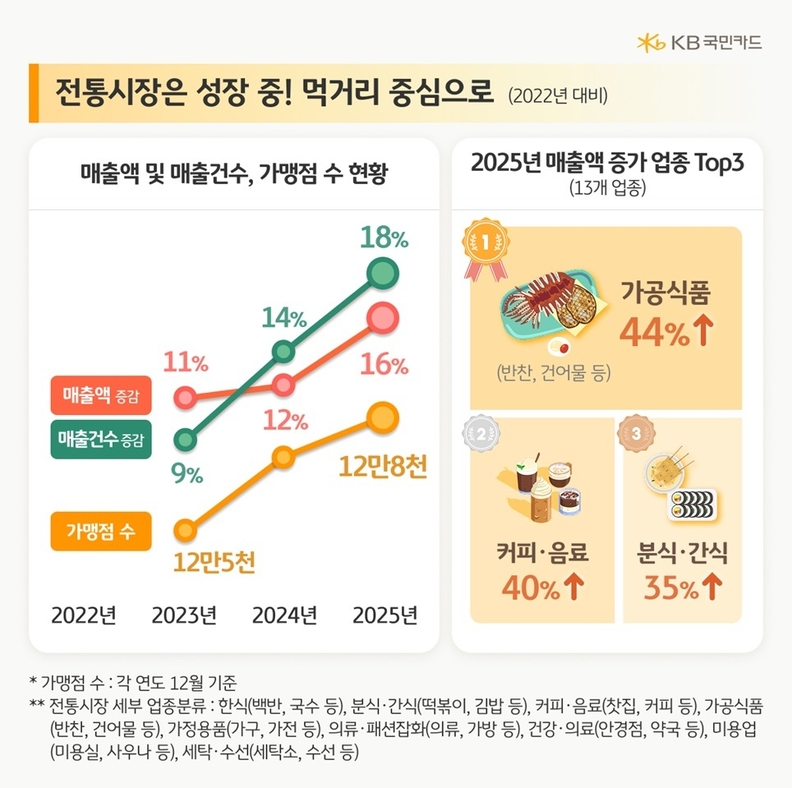 업종별로는 가공식품(44%), 커피·음료(40%), 분식·간식(35%) 순으로 매출 증가폭이 컸다. 특히 가공식품과 커피·음료 업종은 가맹점 수 역시 각각 22%, 11% 증가해 전통시장 내 소비 패턴이 간편식과 외식 중심으로 확대되고 있는 것으로 나타났다. 농수축산물도 안정적인 증가세를 보이며 전통적 소비와 신규 소비가 공존하는 구조가 형성됐다.