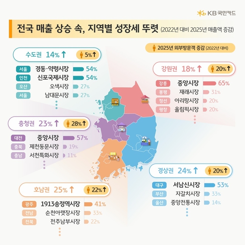 지역별로는 외부 방문객 유입이 눈에 띄게 늘었다. 충청권이 28%로 가장 높은 증가율을 기록했다. 호남권 22%, 경상권과 강원권이 각각 20% 증가했다. 수도권도 5% 증가하며 완만한 상승세를 보였다. 매출 증가율 역시 호남권(25%), 경상권(24%), 충청권(23%) 순으로 나타나 지방 전통시장의 성장세가 두드러졌다.