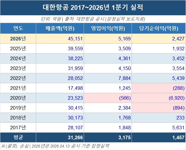 올해 1분기는 외형과 수익성이 동시에 개선됐다. 팬데믹 국면에서는 화물로 대응하고, 회복기에는 여객 중심으로 구조를 재편한 전략이 실적 체질 개선으로 이어졌다는 분석이 나온다. 실제로 올해 1분기 대한항공은 별도 기준 매출 4조5151억원, 영업이익 5169억원, 당기순이익 2427억원을 기록하며 1분기 기준 역대 최대 매출을 달성했다. 전년 동기대비 매출은 14.1%, 영업이익은 47.3%, 당기순이익은 25.6% 각각 증가했다.