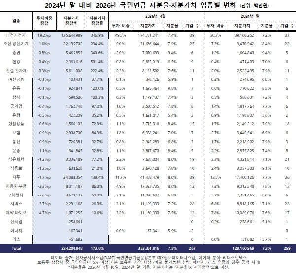 14일 기업분석연구소 리더스인덱스(대표 박주근)가 국민연금이 5% 이상 지분을 보유하고 공시한 267개 상장사 보유지분율 변화(2024년 말 대비 2026년 4월)를 분석한 결과 이같은 흐름이 확인됐다. 조사 대상 기업에 대한 국민연금의 평균 보유 지분율은 7.33%에서 15개월새 7.50%로 0.17%포인트(p) 증가하는 데 그쳤다. 하지만 평가 금액은 129조1610억원에서 353조3618억원(4월 10일 종가 기준)으로 173.6%(224조2008억원) 급증했다.