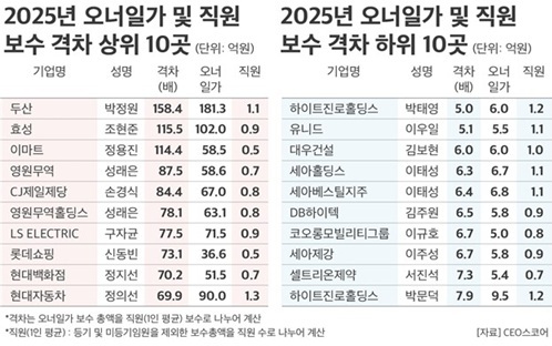 반면 오너와 직원 간 임금 격차가 상대적으로 작은 기업들도 보였다. 하이트진로홀딩스는 7.9배로 가장 낮은 수준을 기록했고, 유니드(5.1배), 대우건설(6.0배), DB하이텍(6.5배), 코오롱모빌리티그룹(6.7배) 등도 한 자릿수 격차를 유지했다. 이는 기업별 보상 정책과 사업 구조에 따라 보수 체계가 달라질 수 있음을 보여준 방증이라는 게 CEO스코어 측 분석이다.