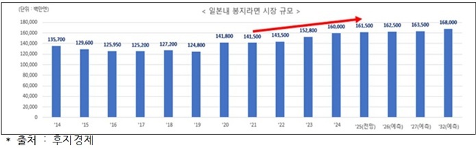 일본 내 봉지라면 시장도 완만한 성장 흐름을 이어가고 있다. 후지경제 자료를 보면 2020년 이후 내식 증가와 비축 수요 영향으로 시장이 확대됐고, 2024년에도 가격 부담을 고려한 소비가 이어지며 성장세를 유지했다. 다만 2025년에는 재난 대비 비축 수요 감소와 폭염 영향으로 판매량 증가세는 둔화됐지만, 가격 상승 영향으로 매출은 소폭 늘어난 것으로 집계됐다.