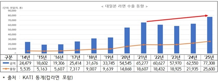[서울타임즈뉴스 = 서연옥 기자] '라면 본토' 일본에 'K-라면' 바람이 불고 있다. 한국 라면의 대일 수출이 감소세를 끝내고 반등에 성공하며 역대 최고치를 기록했다. 코로나19 기간 급증했던 수출은 2022~2023년 조정을 거쳤지만, 2024년부터 회복 흐름을 보인 뒤 2025년에는 수출 금액과 물량이 모두 최대치를 경신했다. 수요 회복을 넘어 시장 내 존재감이 확대되는 국면으로 접어들었다는 평가가 나온다.