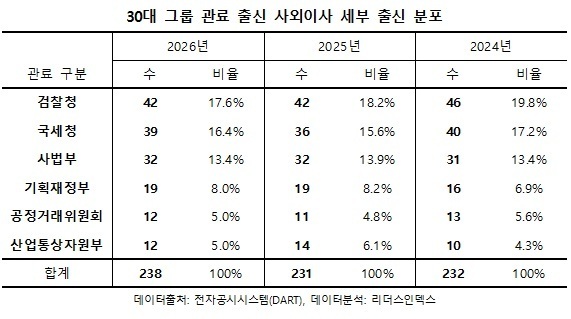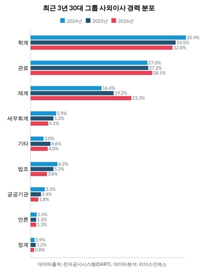 28일 기업분석연구소 리더스인덱스가 자산 상위 30대 그룹 계열사 중 사업보고서를 제출한 229개사의 사외이사 847명(2024~2026년 신규 포함) 분석에서 이같은 결과가 나왔다. 분석 결과 재계 출신 비중은 2024년 16.4%에서 2025년 19.2%, 2026년 23.3%로 상승했다. 재계 출신 사외이사가 20%를 넘어선 것은 이번이 처음이다. 이는 단순한 인적 구성 변화가 아니라, 이사회가 실제 경영 판단에 관여하는 방향으로 이동하고 있음을 보여주는 지표로 해석된다.