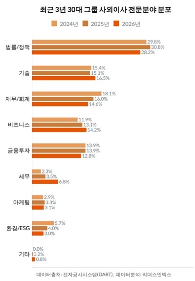 회계(14.6%), 비즈니스(14.2%), 금융투자(12.8%) 분야도 안정적인 비중을 유지하며 이사회 기능 다변화를 뒷받침했다. 반면 ESG·환경 분야는 2024년 5.5%에서 2026년 3.0%로 감소했다. ESG 이슈의 중요성이 낮아졌다기보다, 기업들이 별도의 위원회나 내부 조직으로 기능을 분리하면서 사외이사 구성에서의 비중은 상대적으로 축소된 영향으로 풀이된다.