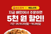 [서울타임즈뉴스 = 서연옥 기자] 더본코리아(대표 백종원)의 한신포차가 10/20~26까지 ‘배달의민족’에서 주문 시 5,000원의 할인 혜택을 제공하는 프로모션을 진행한다고 17일 밝혔다. 배달의민족 앱 내 한신포차 이벤트 페이지에서 5,000원 할인 쿠폰을 다운로드한 후 포장 또는 배달 주문 시 적용하면 된다. ID당 1일 1회 발급 가능하며, 타 쿠폰과 중복 적용은 불가하다. 한신포차 관계자는 “선선한 가을철, 포차 메뉴가 생각나는 계절을 맞아 고객들이 가격 부담 없이 한신포차의 인기 메뉴를 간편하게 즐길 수 있도록 이번 행사를 준비했다”라며, “앞으로도 고객들에게 합리적인 가격으로 맛있는 음식을 제공할 수 있도록 지속 노력하겠다”고 전했다.