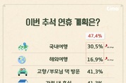 [서울타임즈뉴스 = 서연옥 기자] 롯데멤버스(대표이사 김혜주) 자체 리서치 플랫폼 ‘라임(Lime)’이 추석 계획 설문조사 결과를 공개한다고 25일 밝혔다. 이번 설문(표본오차 95% 신뢰수준에서 ±3.10%p)은 전국 성인 남녀 1천 명을 대상으로 8월 28~29일 진행됐다. 올해 추석은 최장 10일 간의 황금연휴인 만큼 ‘여행을 떠난다’는 답변이 2명 중 1명 꼴인 47.4%로 1위를 차지했다. 이중 국내 여행은 전년 대비 20.6%p 상승한 30.5%, 해외 여행은 10.5%p 상승한 16.9%로 조사됐다. ‘고향·부모님 댁을 방문한다’, ‘가정 내 휴식을 취한다’는 답변은 각각 동일하게 41.3%로 뒤를 이었다. 국내 인기 여행지는 강원도(27.2%), 경상도(26.6%), 제주도(25.9%) 순으로 나타났으며, 해외는 일본(39.6%), 동남아(20.7%), 미주(11.2%) 순이었다. 여행 기간은 추석 연휴를 포함해 국내 평균 4.5일, 해외 평균 6.4일을 간다고 답했다. 여행을 계획하지 않은 이들은 ‘성수기라 사람이 많을 것 같아서(38%)’, ‘경제적 부담이 커서(33.1%)’, ‘고향·부모님 댁을 방문해야 해서(30.7%)’를 이유로 꼽았다