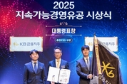 [서울타임즈뉴스 = 최남주 기자] KB금융그룹은 16일 산업통상부와 중소벤처기업부가 주최하고 한국생산성본부가 주관한 ‘2025 지속가능경영유공 정부포상’에서 종합 ESG 부문 최고 등급인 대통령 표창을 수상했다고 17일 밝혔다. 지속가능경영유공 정부포상은 지속가능경영을 통해 산업 경쟁력 강화와 사회적 가치 창출에 기여한 기업과 단체를 선정하는 ESG 분야 국내 유일의 정부포상이다. KB금융은 이번 수상을 통해 국내 최고 수준의 ESG 경영 역량을 공식적으로 인정받았다. KB금융은 환경·사회·지배구조 전 영역에서 실질적인 성과를 창출해온 점에서 높은 평가를 받았다. 환경 부문에서는 그룹 중장기 탄소중립 전략인 ‘Net Zero S.T.A.R.’를 통해 2030년까지 온실가스 배출량 42% 감축 목표를 수립하고, 저탄소 사회 전환을 위한 실행력을 강화하고 있다. 또 ‘KB Green Wave 2030’ 전략을 바탕으로 33조2000억원 규모의 ESG 금융을 공급하며 기업들의 에너지 전환과 기후 리스크 대응을 적극 지원하고 있다. 사회 부문에서는 미래세대 보호와 지역사회 자립을 위한 포용적 금융 활동이 주목받았다. KB금융은 보건복지부와 협력해 아동 야간 돌봄 공