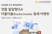 [서울타임즈뉴스 = 최남주 기자] KB국민은행(은행장 이환주)이 연말을 맞아 오는 12월 12일까지 절세상품을 이용하는 고객을 대상으로 ‘연말 일임형ISA 더블더블(Double Double)절세 이벤트’를 실시한다. 이번 이벤트는 일임형ISA와 연금저축펀드 신규 가입 및 추가입금 고객을 대상으로 진행한다. 이 행사는 또 조건에 따라 경품 추첨과 KB금융쿠폰 제공 혜택을 받을 수 있다. 먼저 일임형ISA 1천만원 이상 가입, 계좌이전(전입), 추가입금 하거나 일임형ISA와 연금저축펀드를 각각 500만원 이상 신규 가입한 고객에게 추첨을 통해 ▲삼성 비스포크 AI스팀 로봇청소기 ▲서울신라호텔 더 파크뷰 식사권(2인) ▲애플워치 SE3(3명) ▲신세계 이마트 1만원 모바일 상품권(500명)이 제공된다. KB금융쿠폰 지급 이벤트도 함께 진행한다. 일임형ISA 만기자금을 연금저축펀드에 300만원 이상 입금하는 고객 모두에게 일임형ISA 신규 가입 시 사용할 수 있는 ‘KB금융쿠폰’ 1만원이 제공된다. 이외에도 일임형ISA를 KB스타뱅킹을 통해 2000만원 이상 가입 시 2만원의 ‘KB금융쿠폰’을 제공한다.